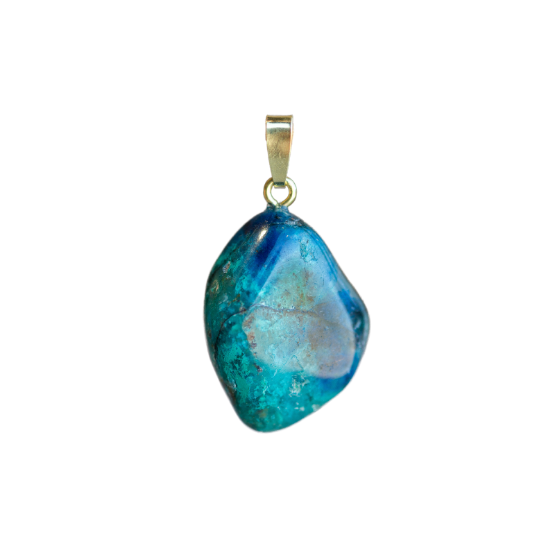 Draag deze hanger dicht bij je hart om emoties te verzachten en communicatie te versterken. Chrysocolla is een fijne steen tijdens stressvolle periodes en kan helpen bij het vergroten van zelfvertrouwen en vertrouwen in je eigen pad.